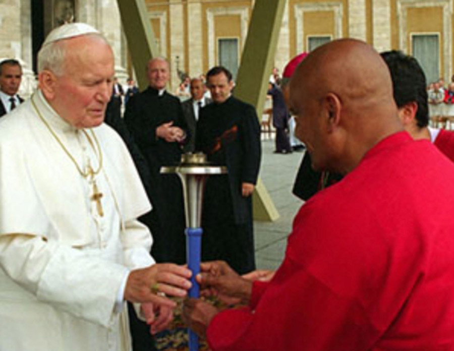 Sri Chinmoy shared the peace Torch with Pope John Paul II on 31 May 1995, at the Vatican, sharing the message “I salute the runners of the Peace Run who are carrying a torch to the destination of peace through the streets of the world.”