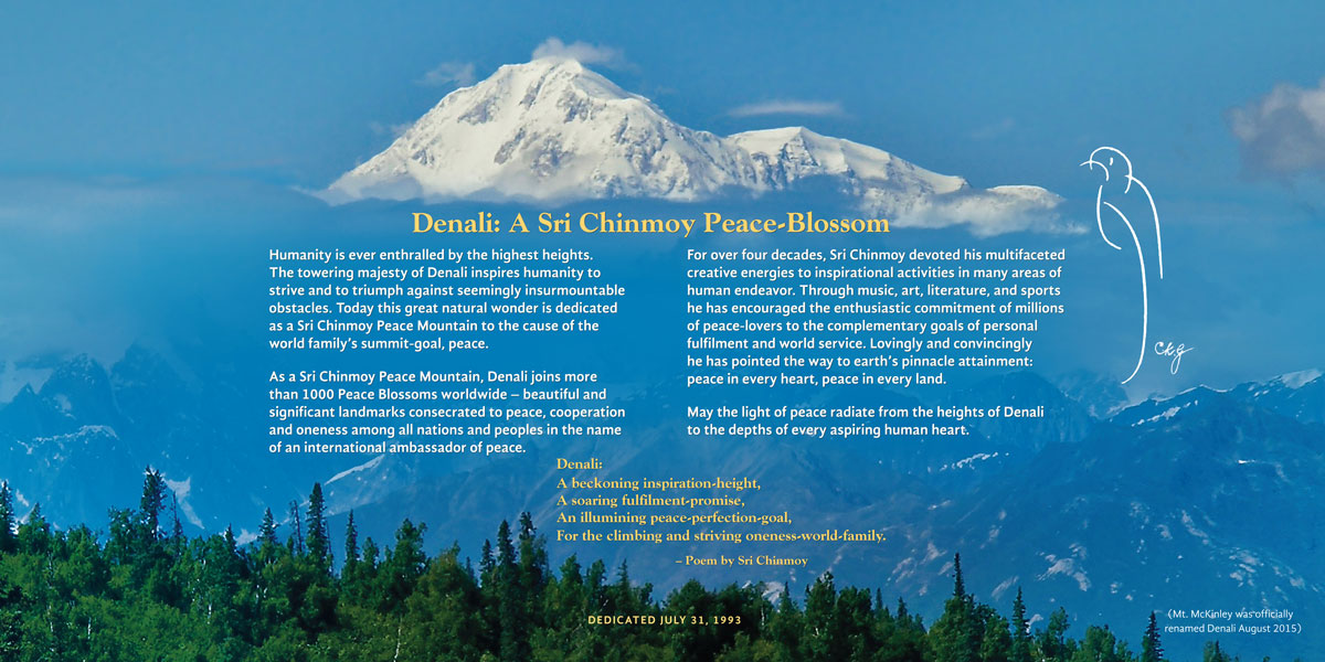 Denali, in Alaska, is the highest peak in the USA, and in North America. It was dedicated a Sri Chinmoy Peace-Blossom in July 1993. This year, we redesigned the commemorative plaque and it now has a new location - the Talkeetna Roadhouse - where travellers can reflect on the ideals of peace as they view this sparkling natural jewel.